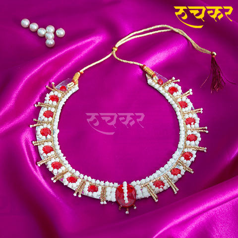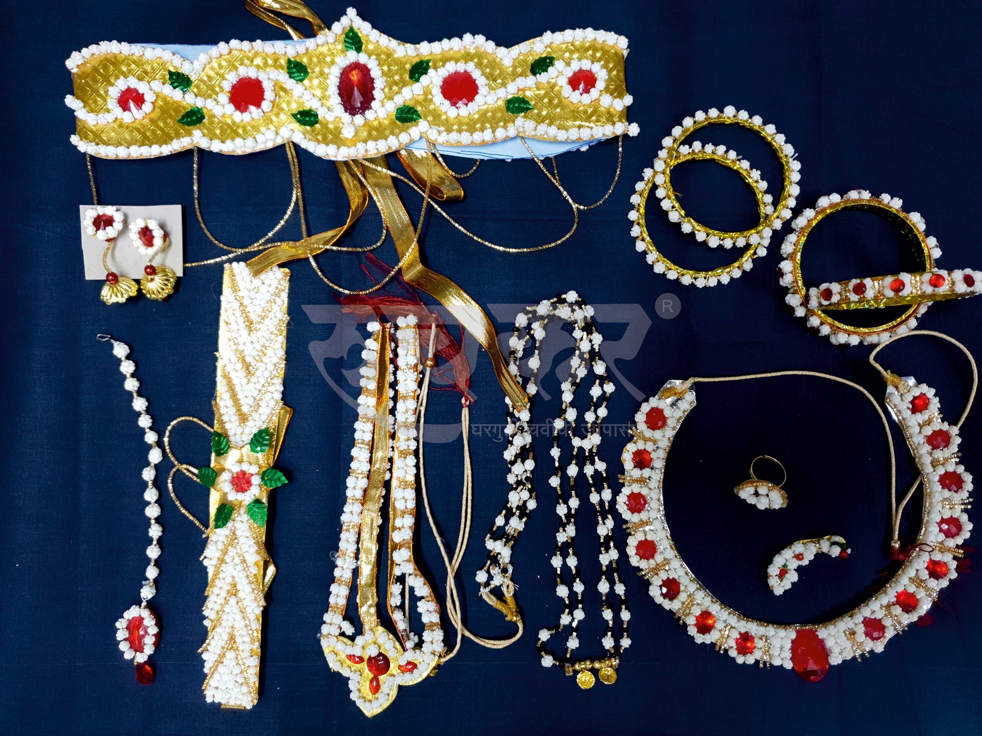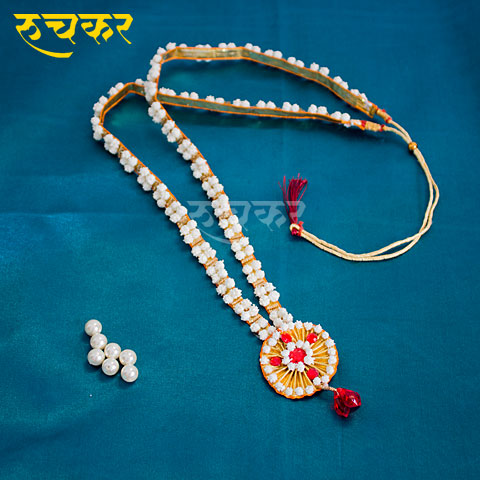 This set contains beautifully crafted Shahi Har, Kambarpatta, Necklace, Tode Jod, Bangdi Jod, Double Mangalsutra, Bindi, Waki, Nath, Angathi, Zumke. More than 10% discount is included in price.